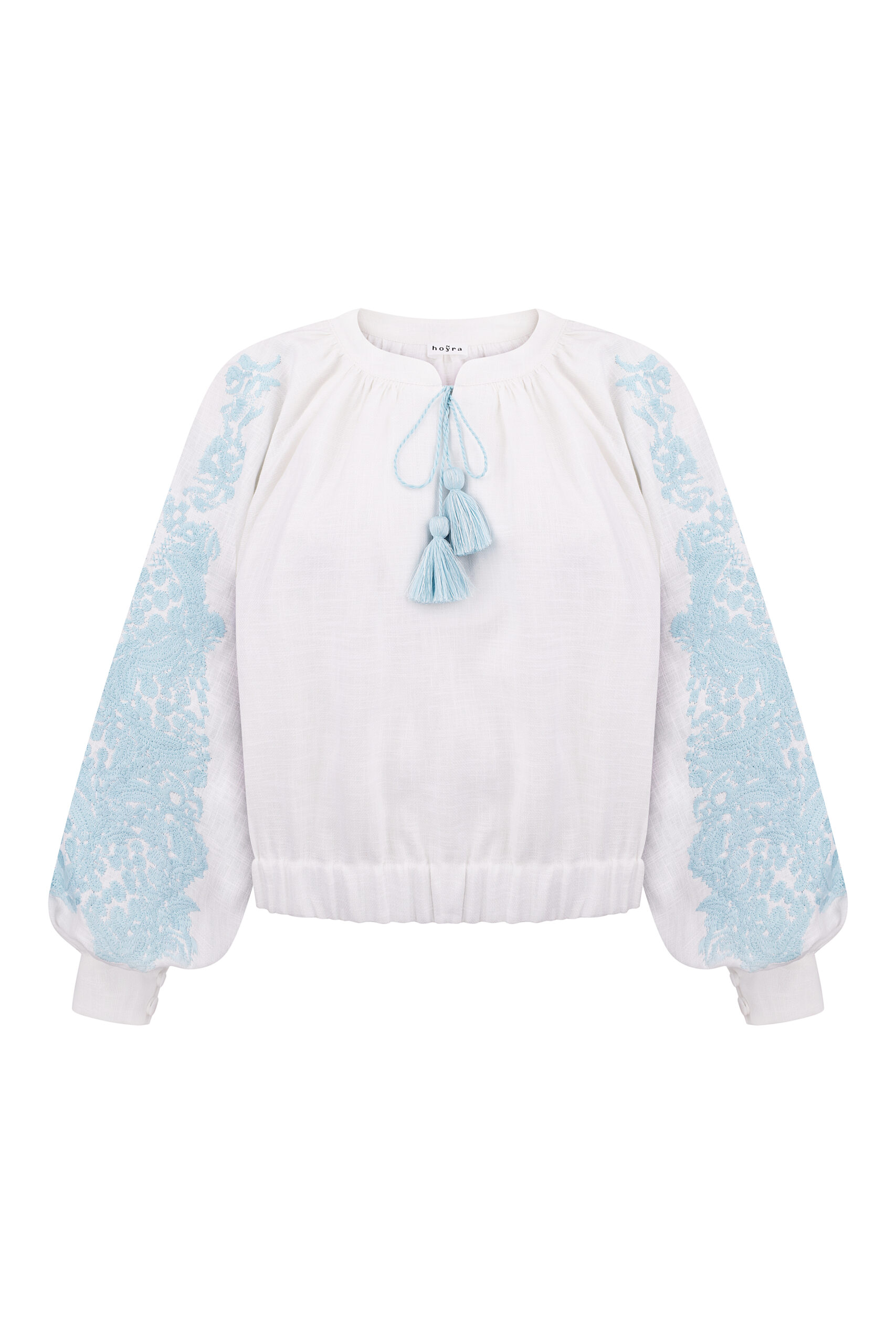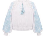 Блуза з вишивкою в техніці гладь. Тканина льон. Блуза бомбер при зібрана по низу на гумці. Вільний силует. Китиці ручної роботи, які можна при бажані зняти. До блузи є комплект спідниця. Довжина виробу по спинці ~ 55 см.