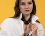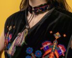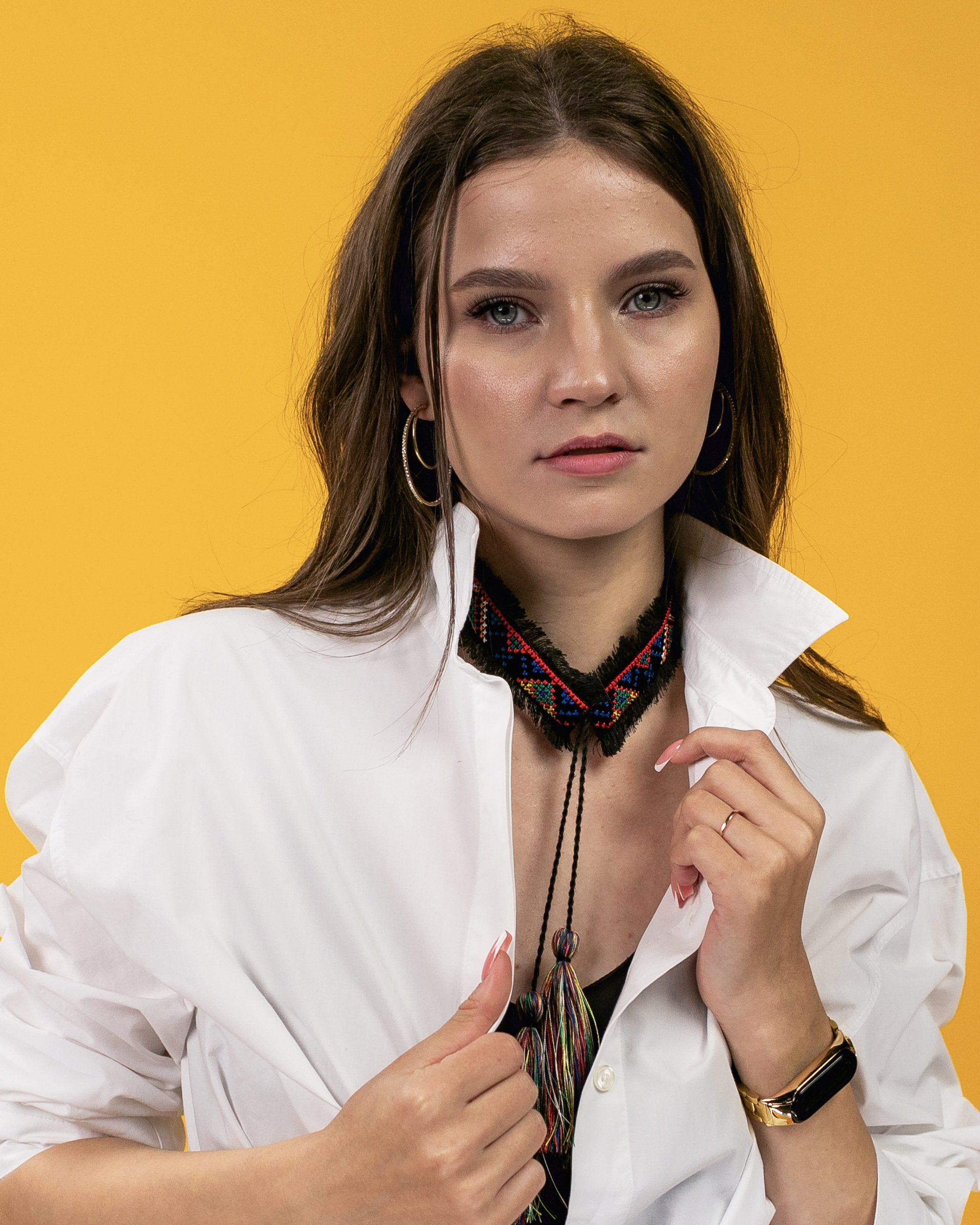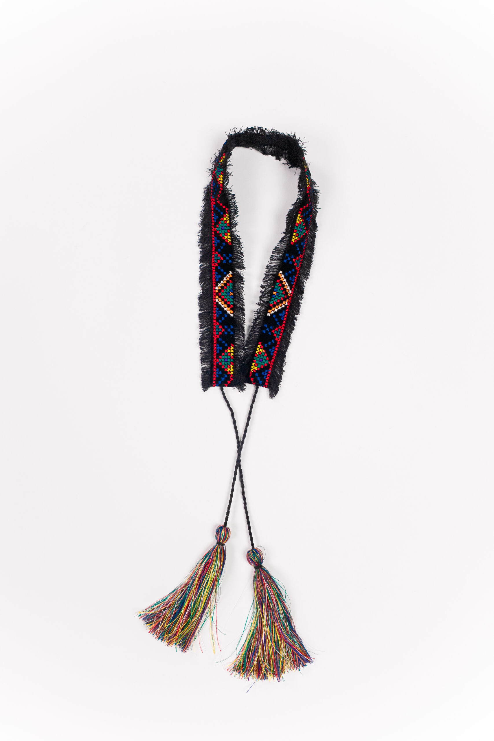 Чокер з вишивкою з обох боків і китицями. Один бік яскравий, а другий – чорний по чорному, як і жилетка. Його можна носити як намисто або головний убір. Це універсальний та багатофункціональний аксесуар.