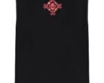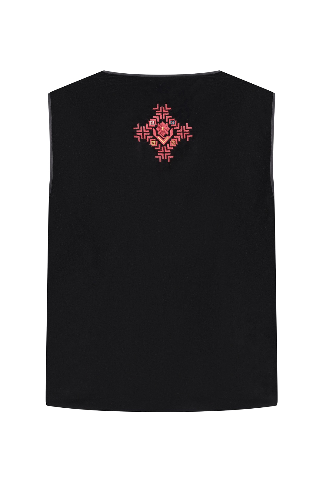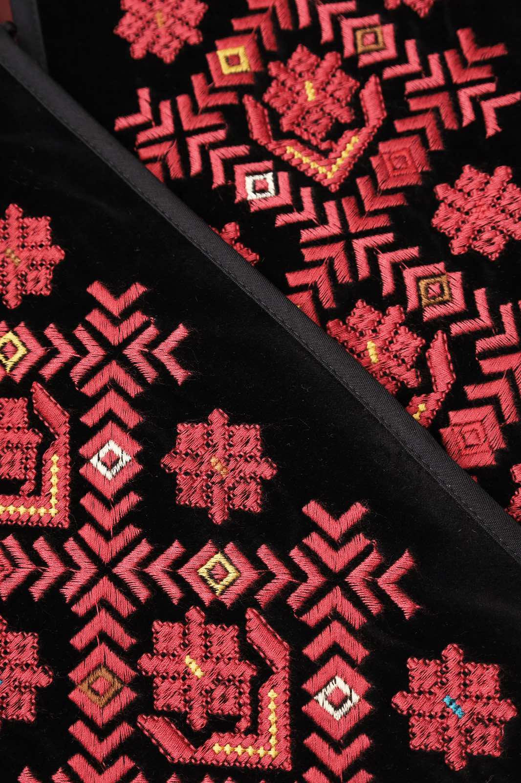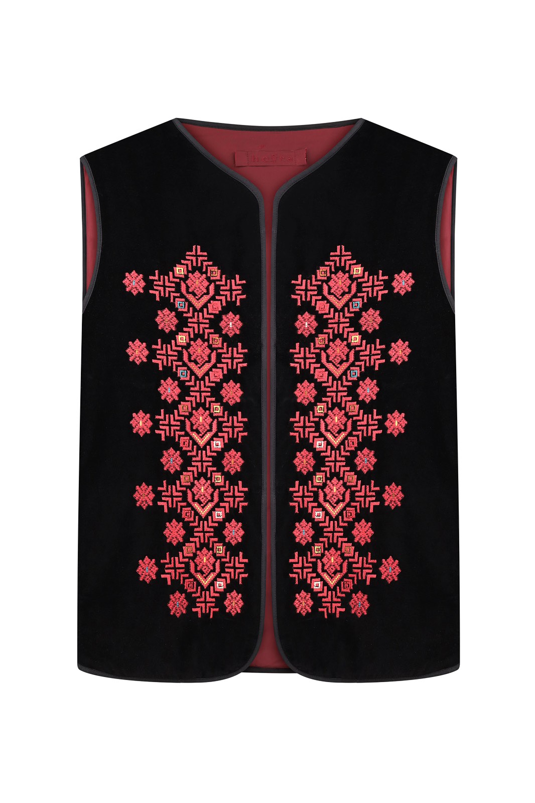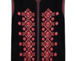 Жилет з бордовою вишивкою в техніці гладь (машинна вишивка) подовжений. На чорному оксамиті з утепленням. На підкладці.