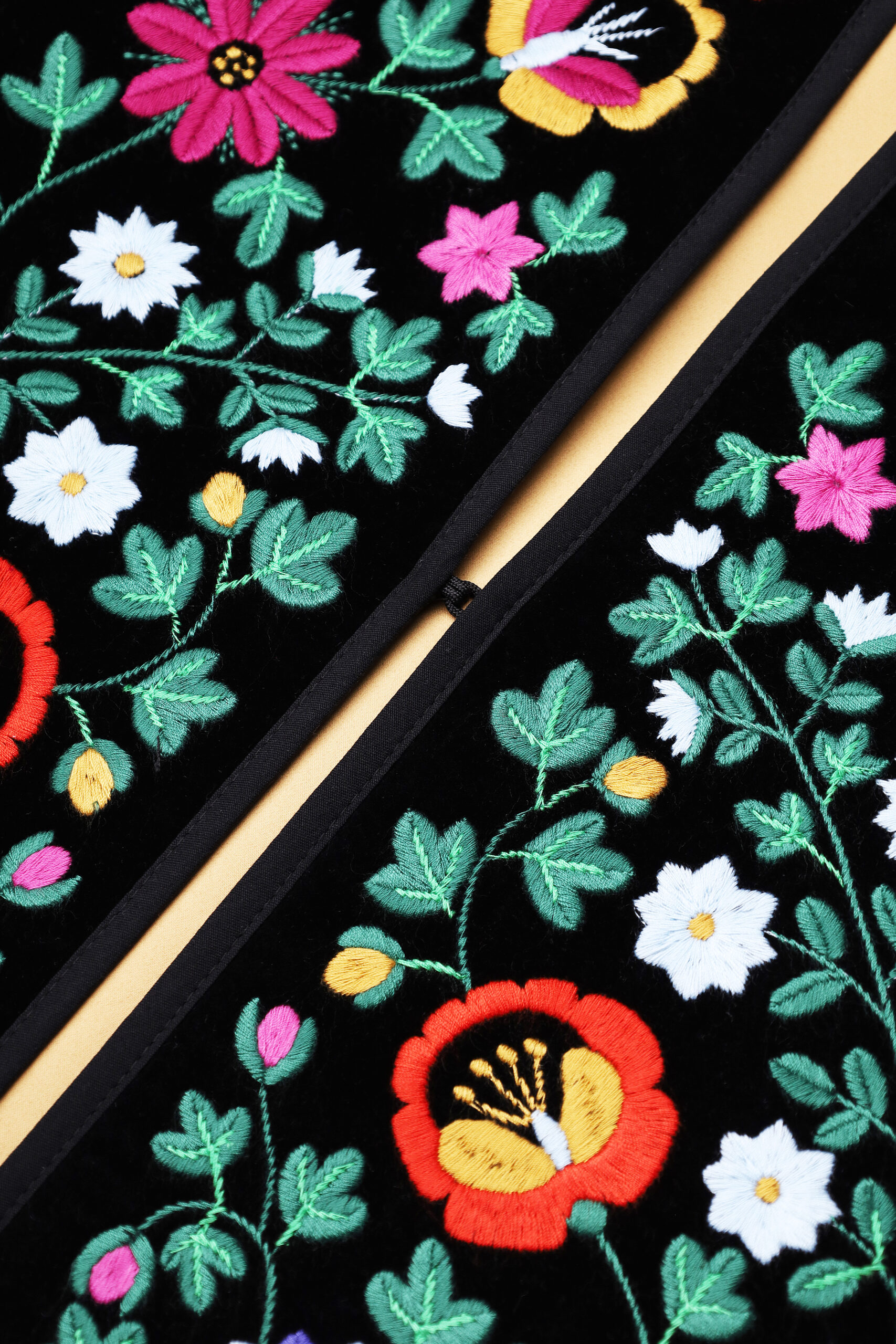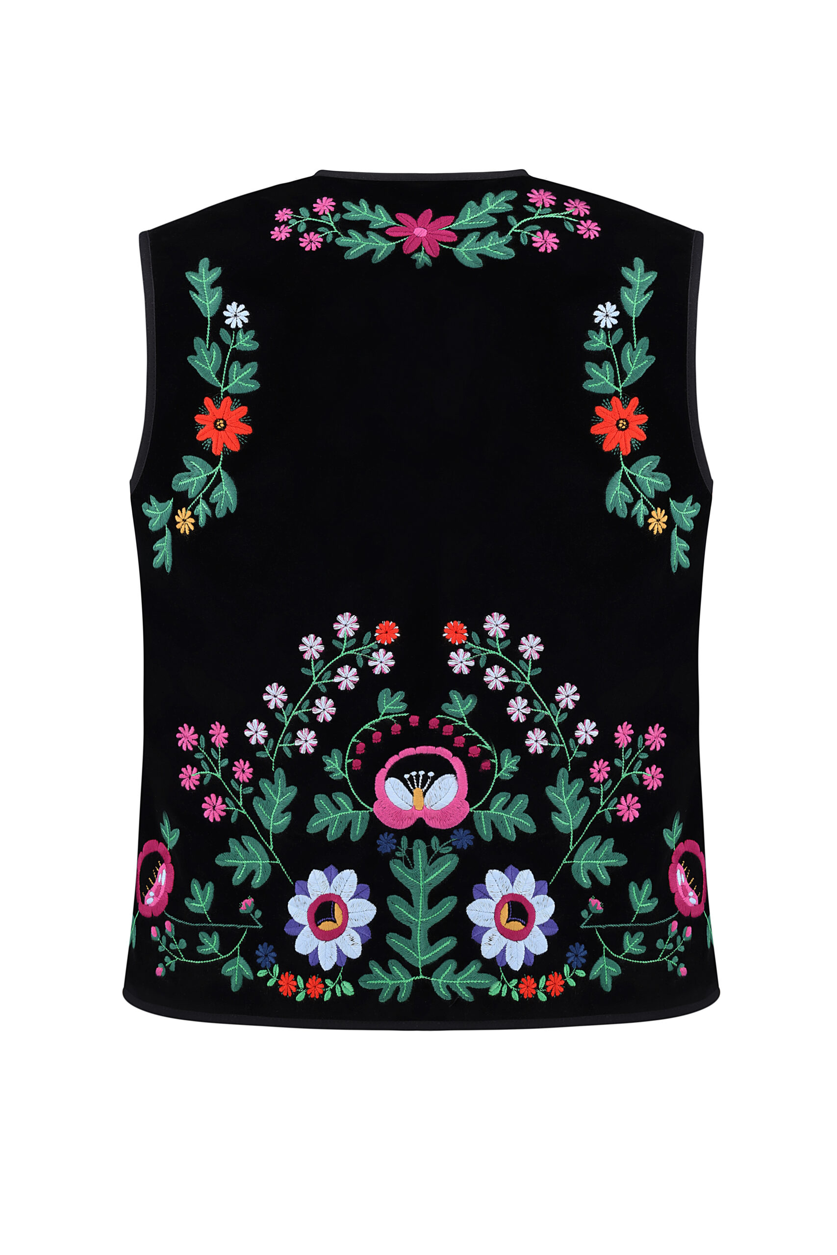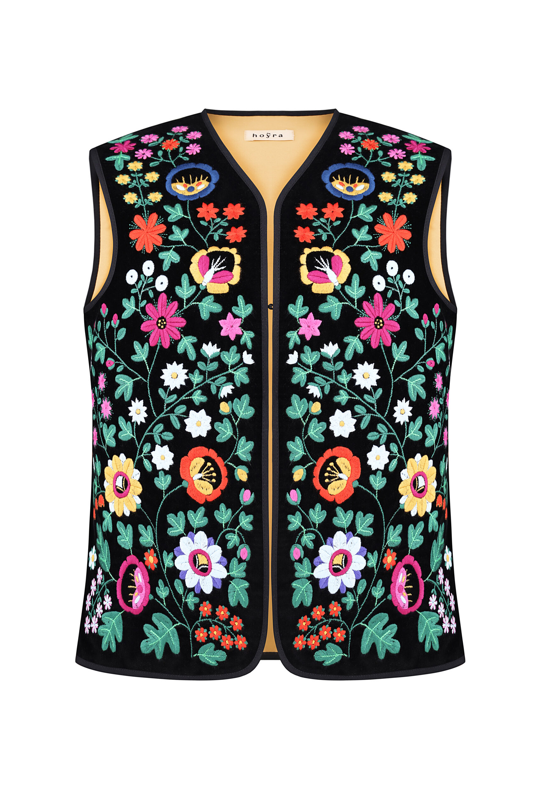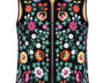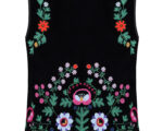 Жилет з вишивкою в техніці гладь (машинна вишивка). Тканина оксамит. Злегка приталеного силуету з застібкою гачок. На підкладці. Довжина виробу по спинці 60 см.