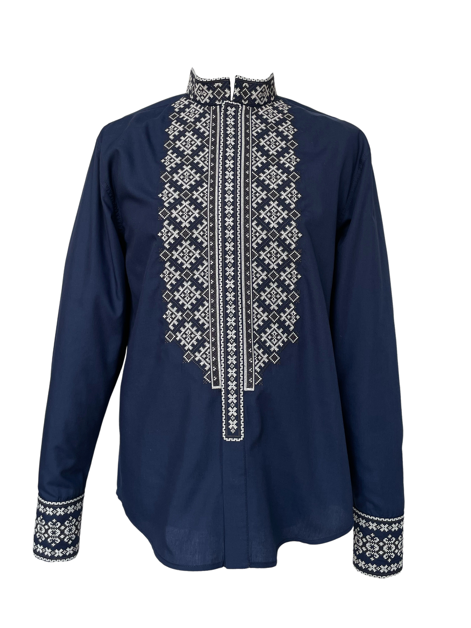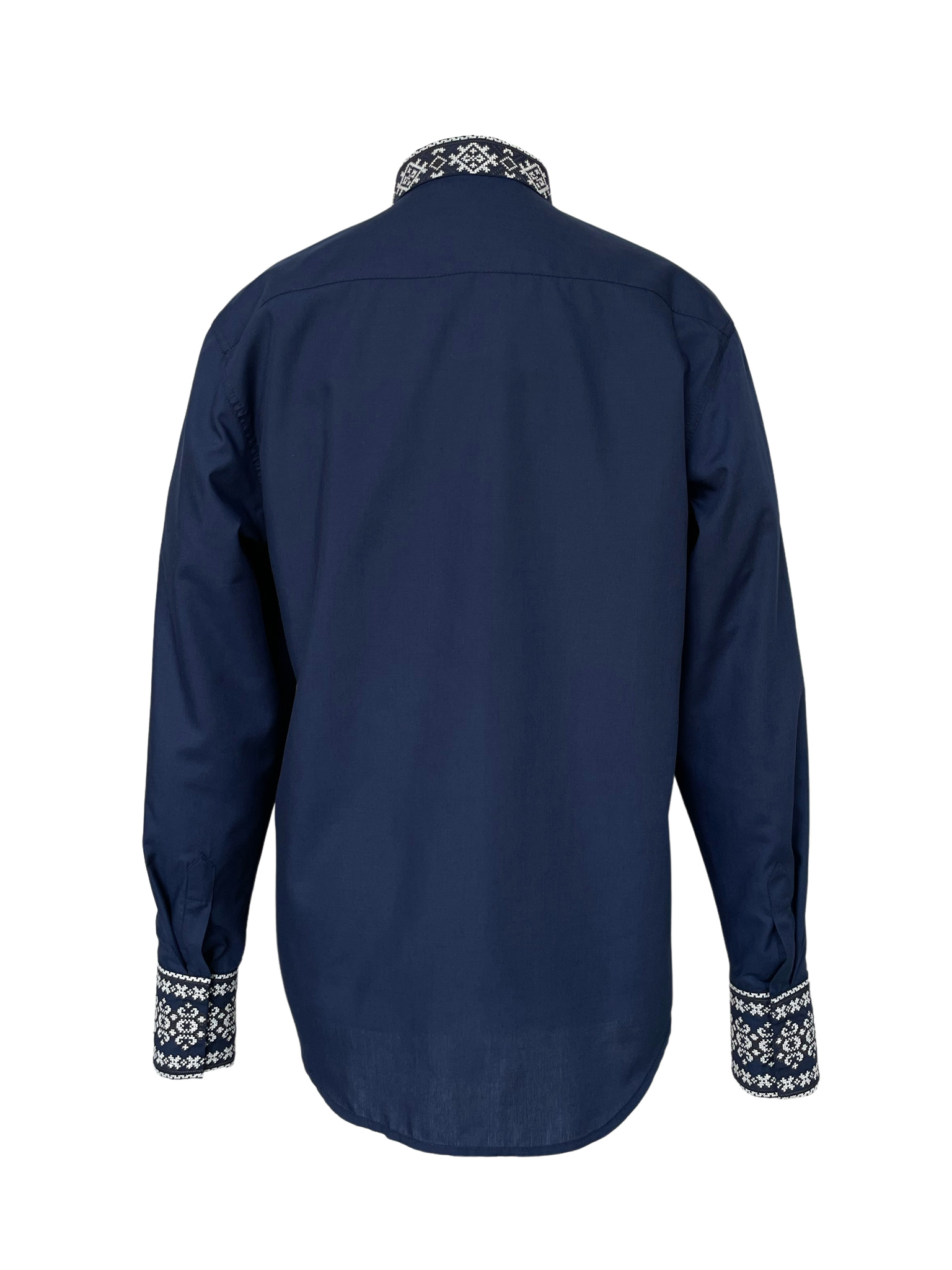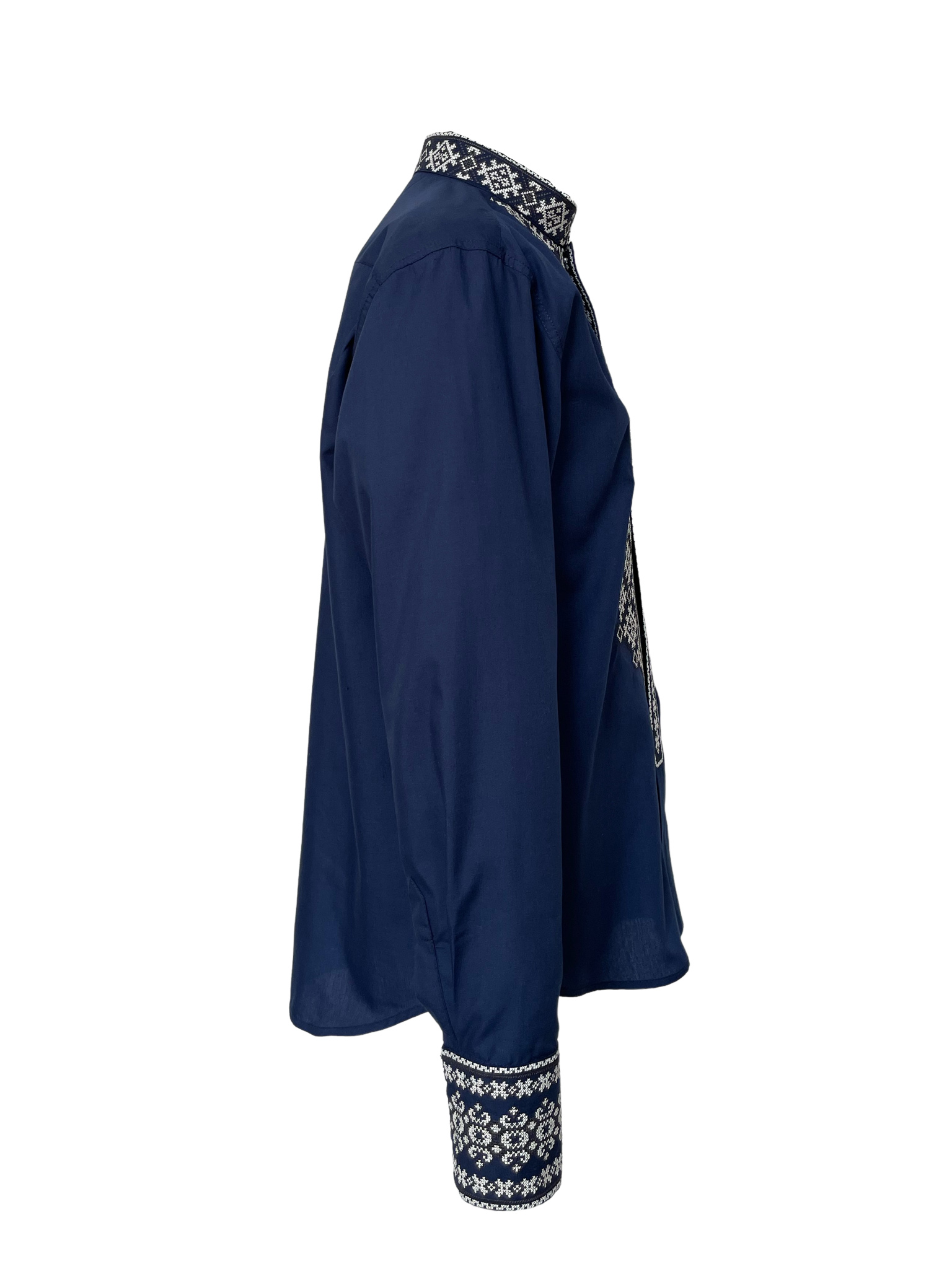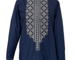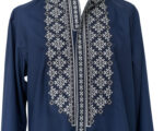 Вишиванка середньої довжини, має трохи приталений силует. Рукава моделі мають широкі манжети, які фіксуються кнопками. Головною окрасою сорочки є колірне оформлення та оздоблення витонченими білими вишитими візерунками.