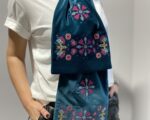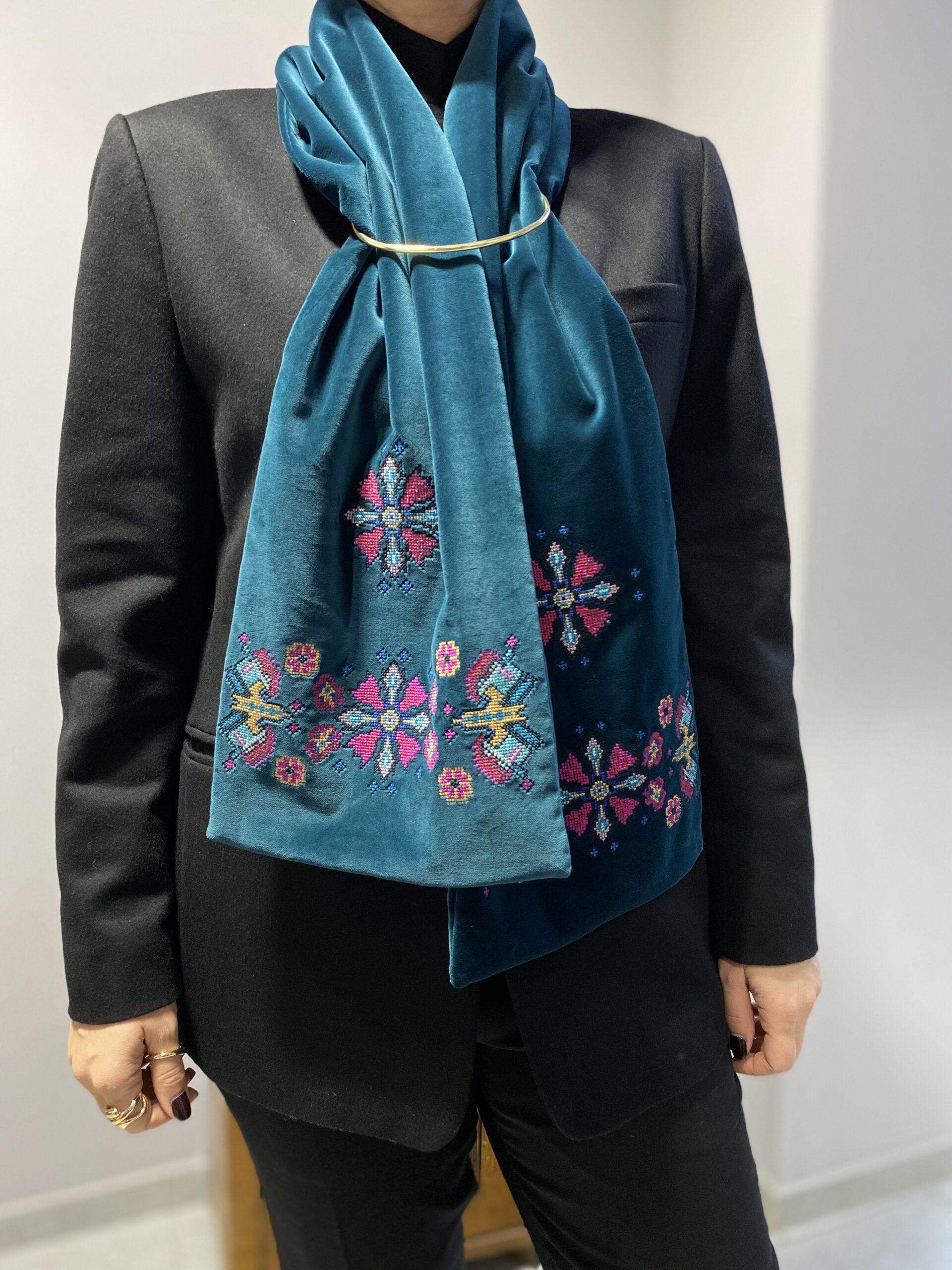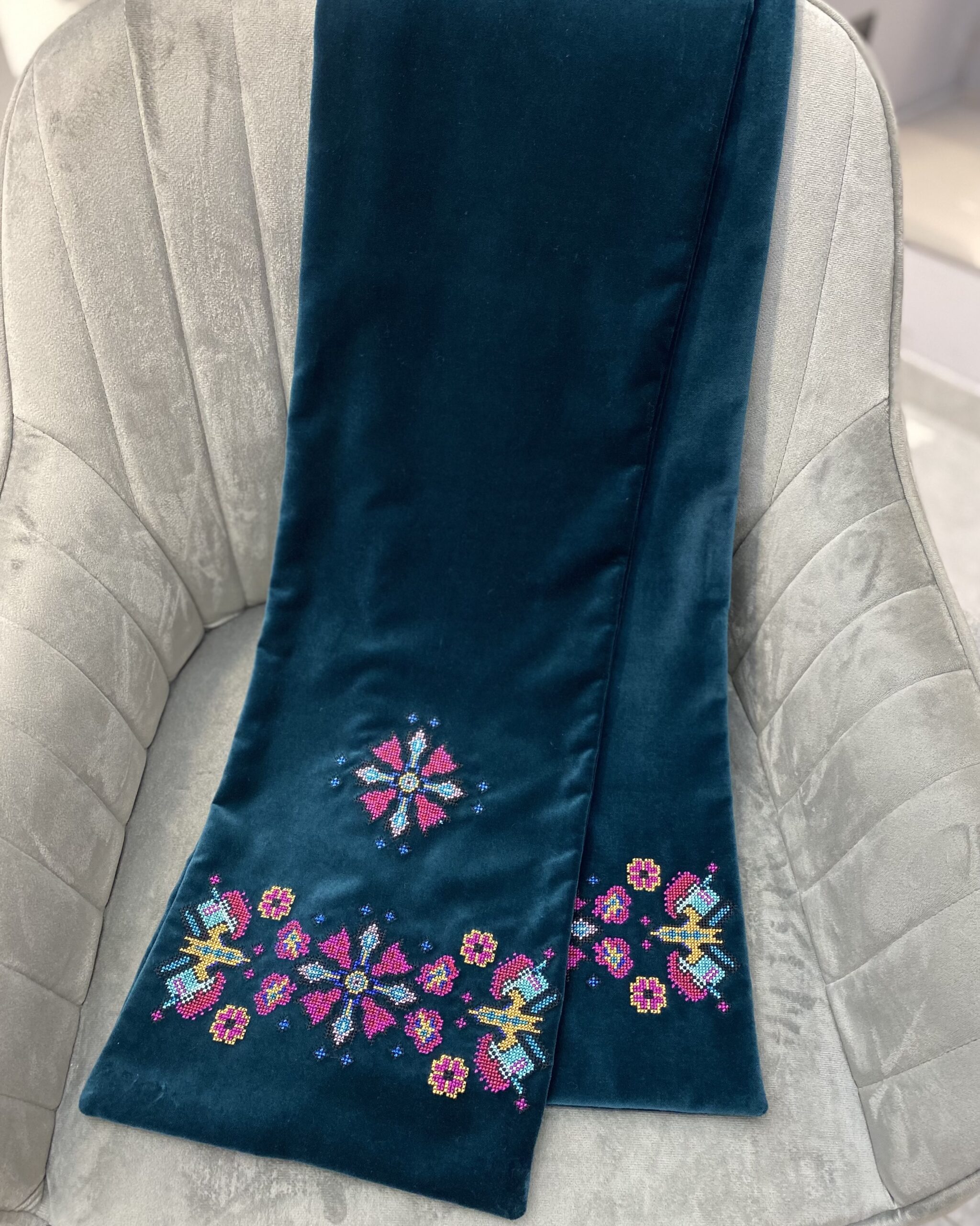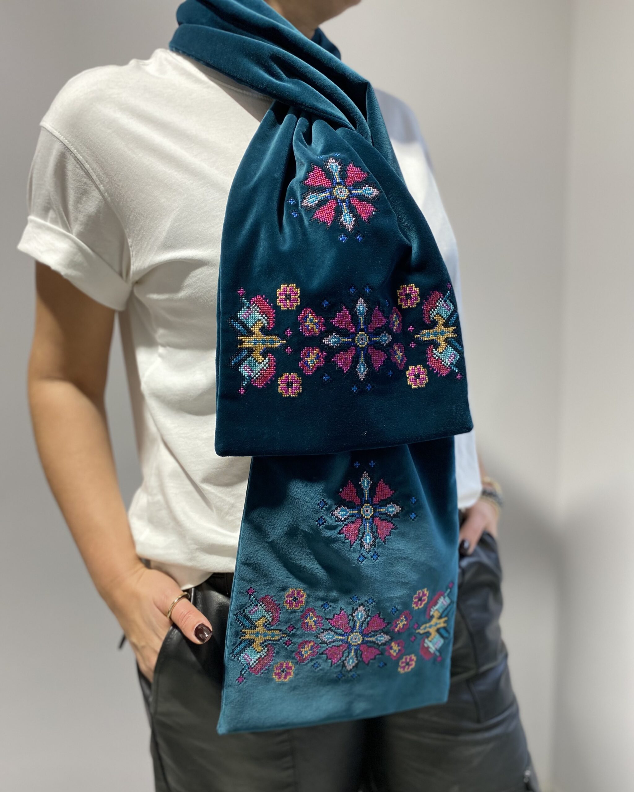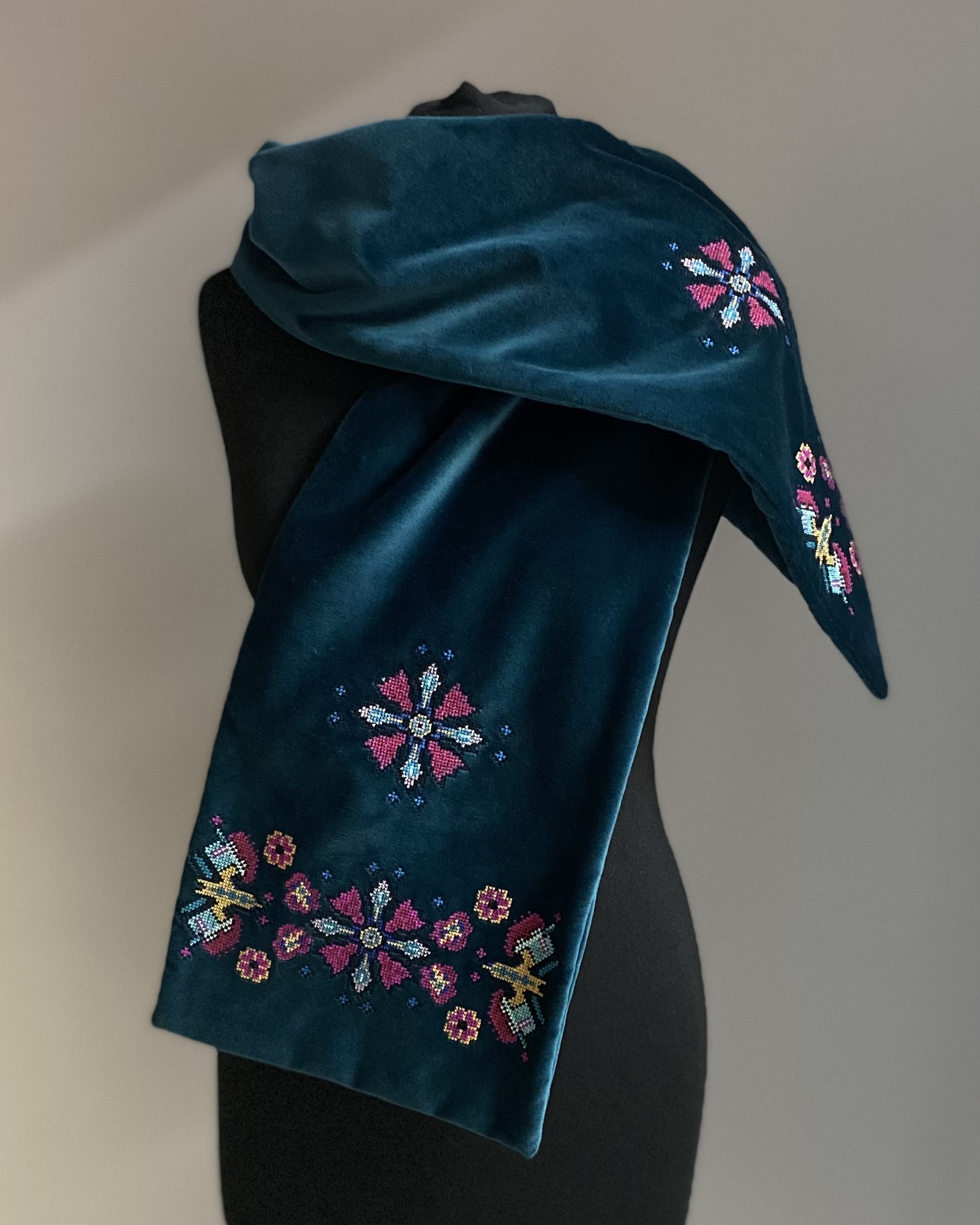 Двосторонній оксамитовий шалик в смарагдовому кольорі з вишивкою в техніці хрестик. Довжина виробу ~ 153 см, ширина ~ 24 см