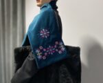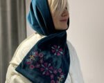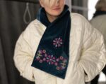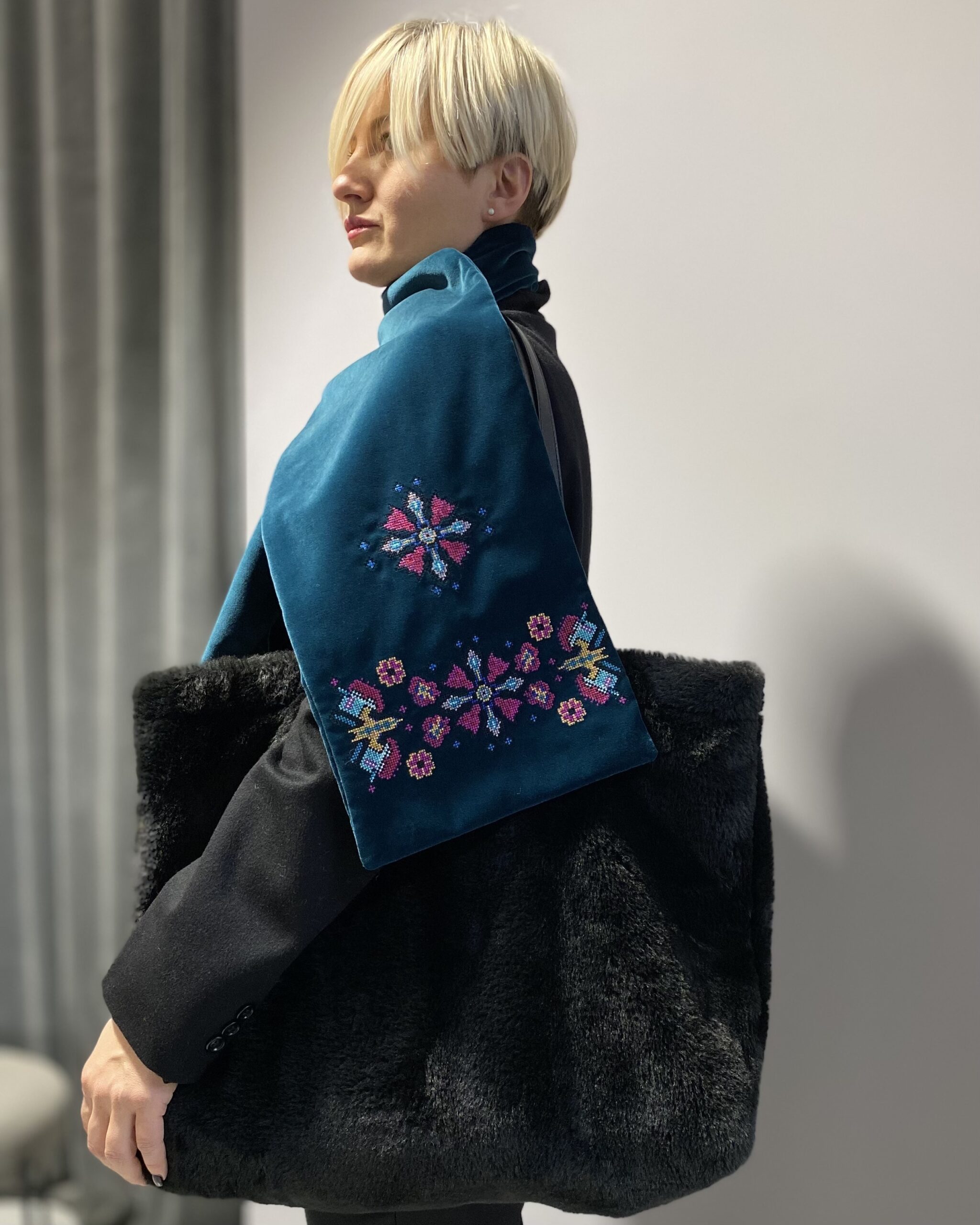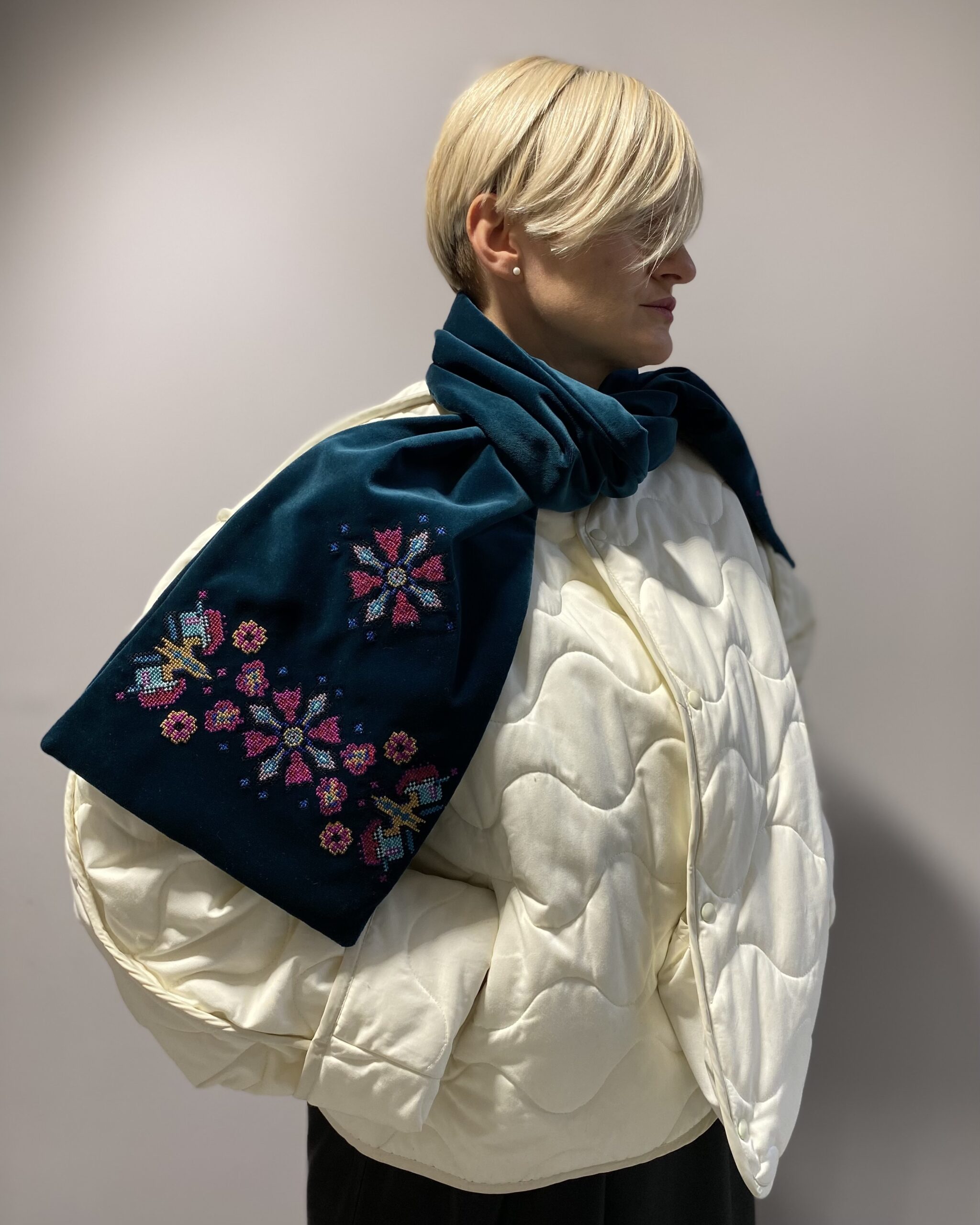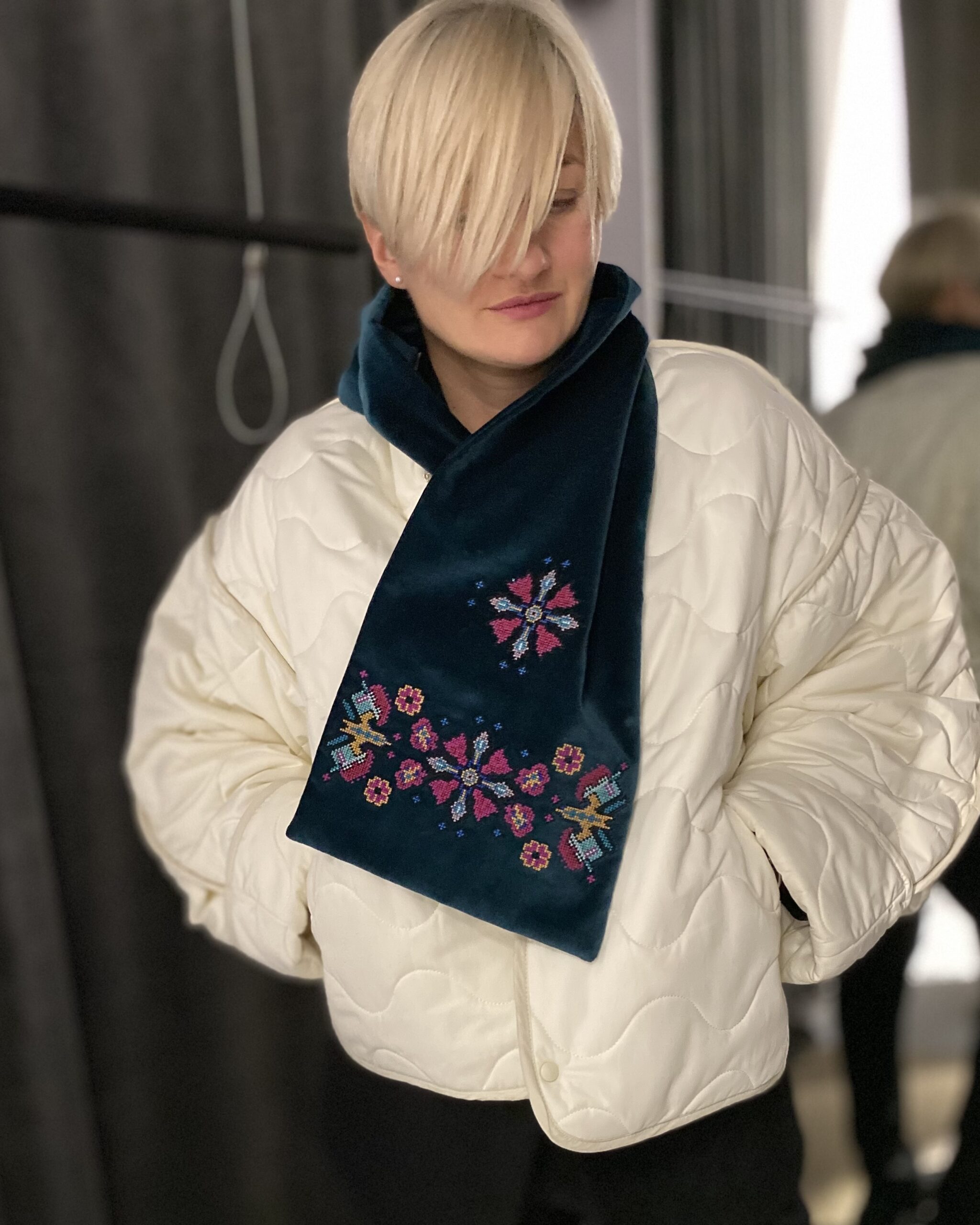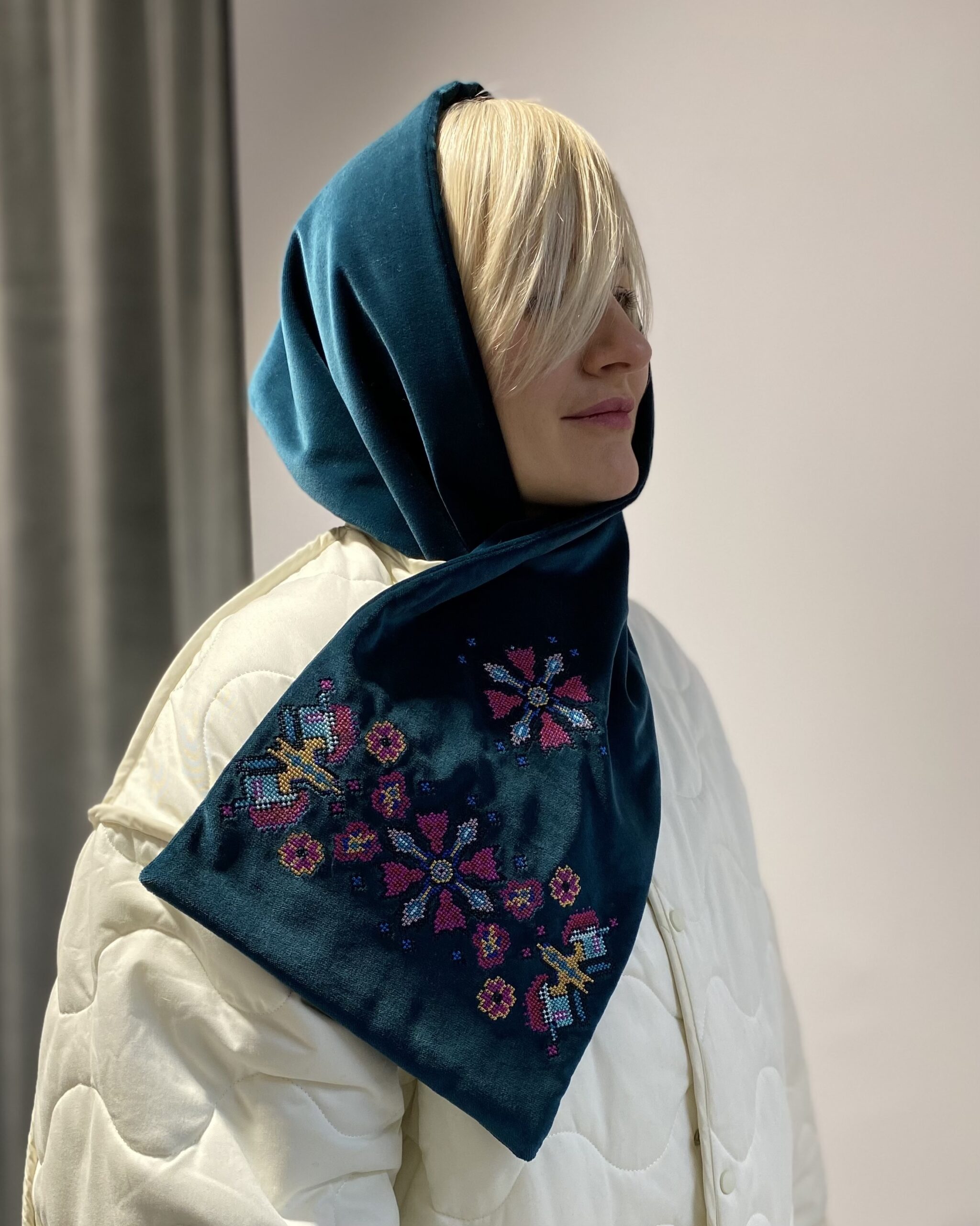 Двосторонній оксамитовий шалик в смарагдовому кольорі з вишивкою в техніці хрестик. Довжина виробу ~ 153 см, ширина ~ 24 см