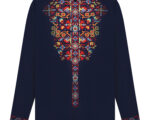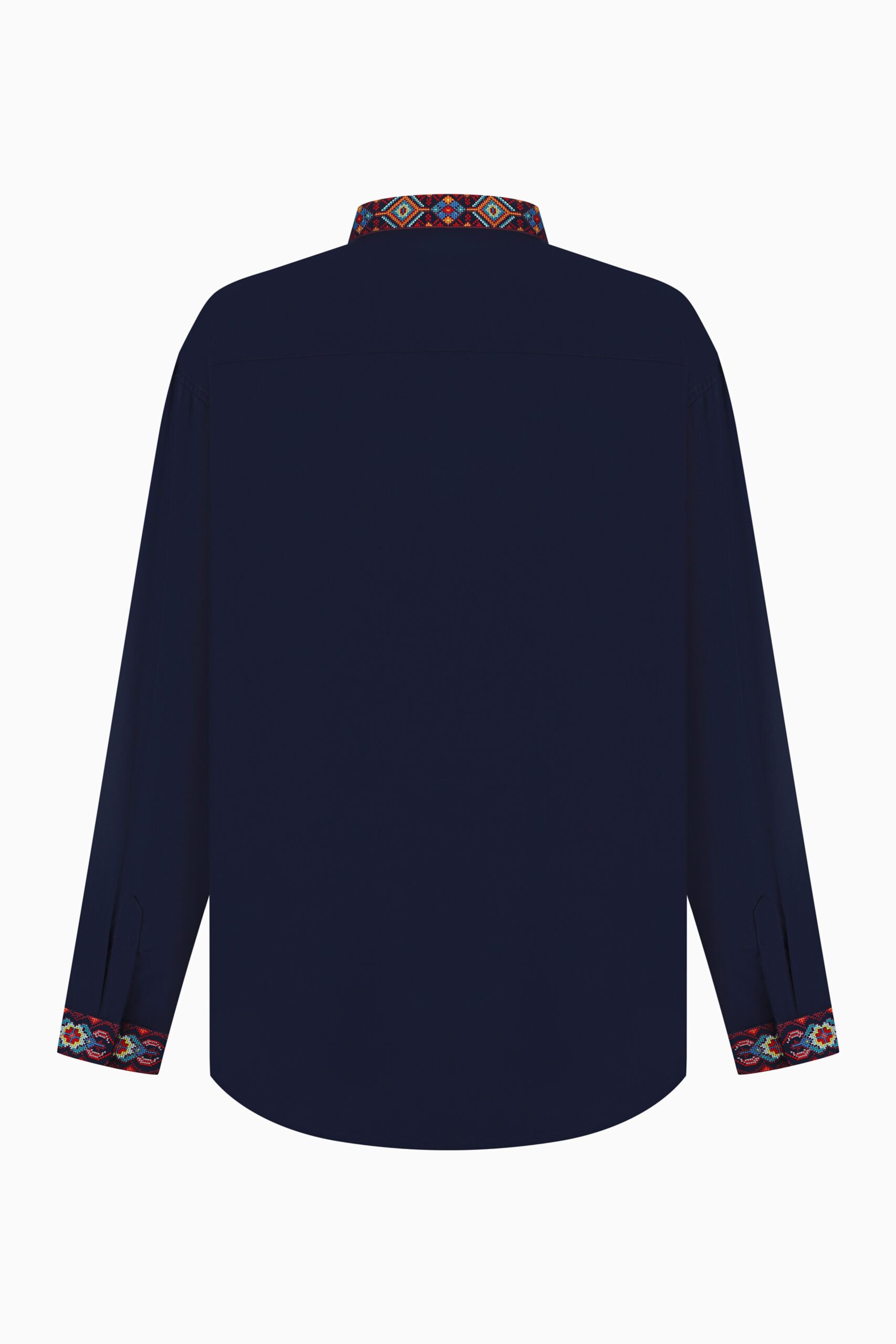 Сорочка з вишивкою в техніці хрестик . Модель на планку з комірцем вишитою стійкою. Тканина льон синій. Вільний силует, прямий крій.