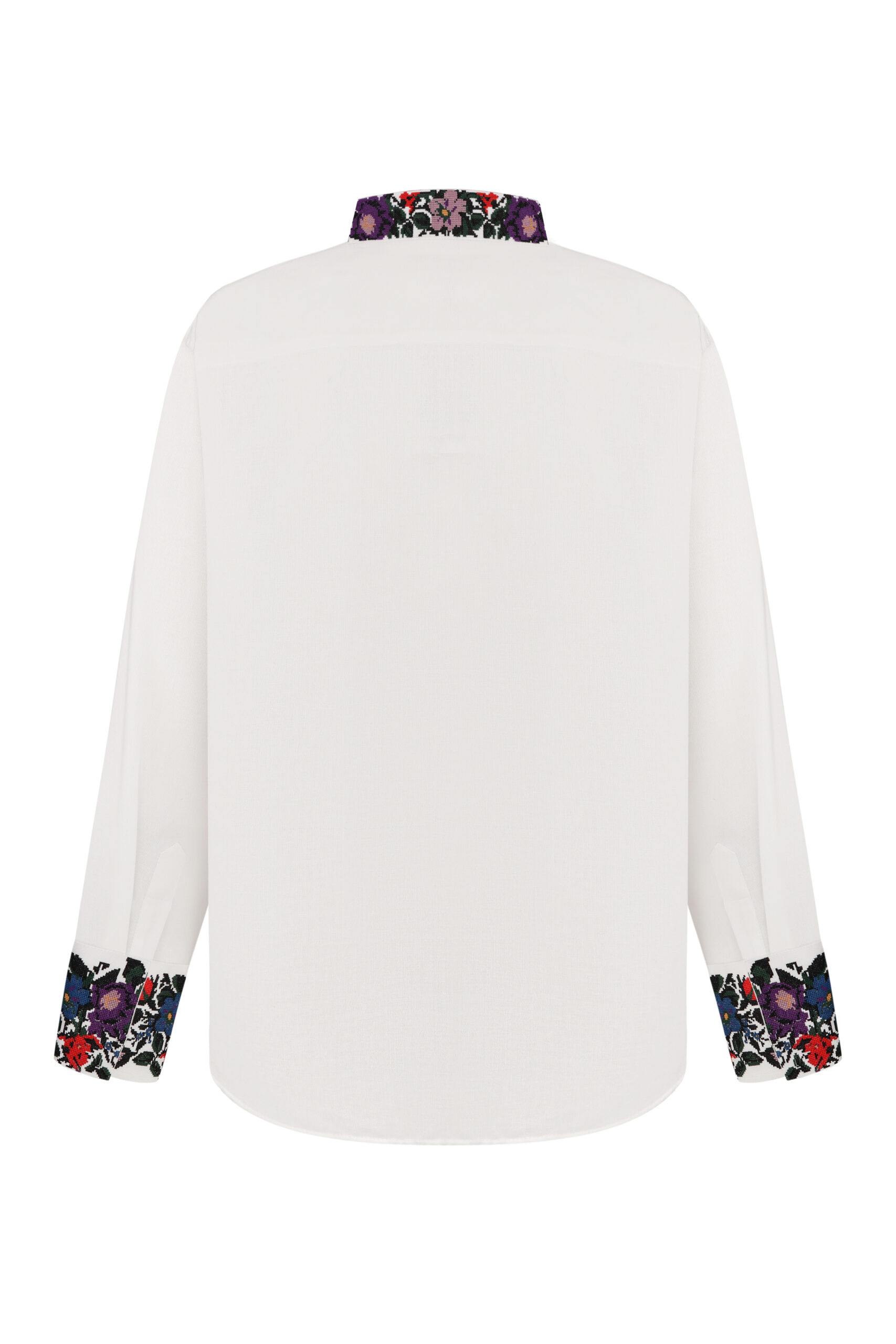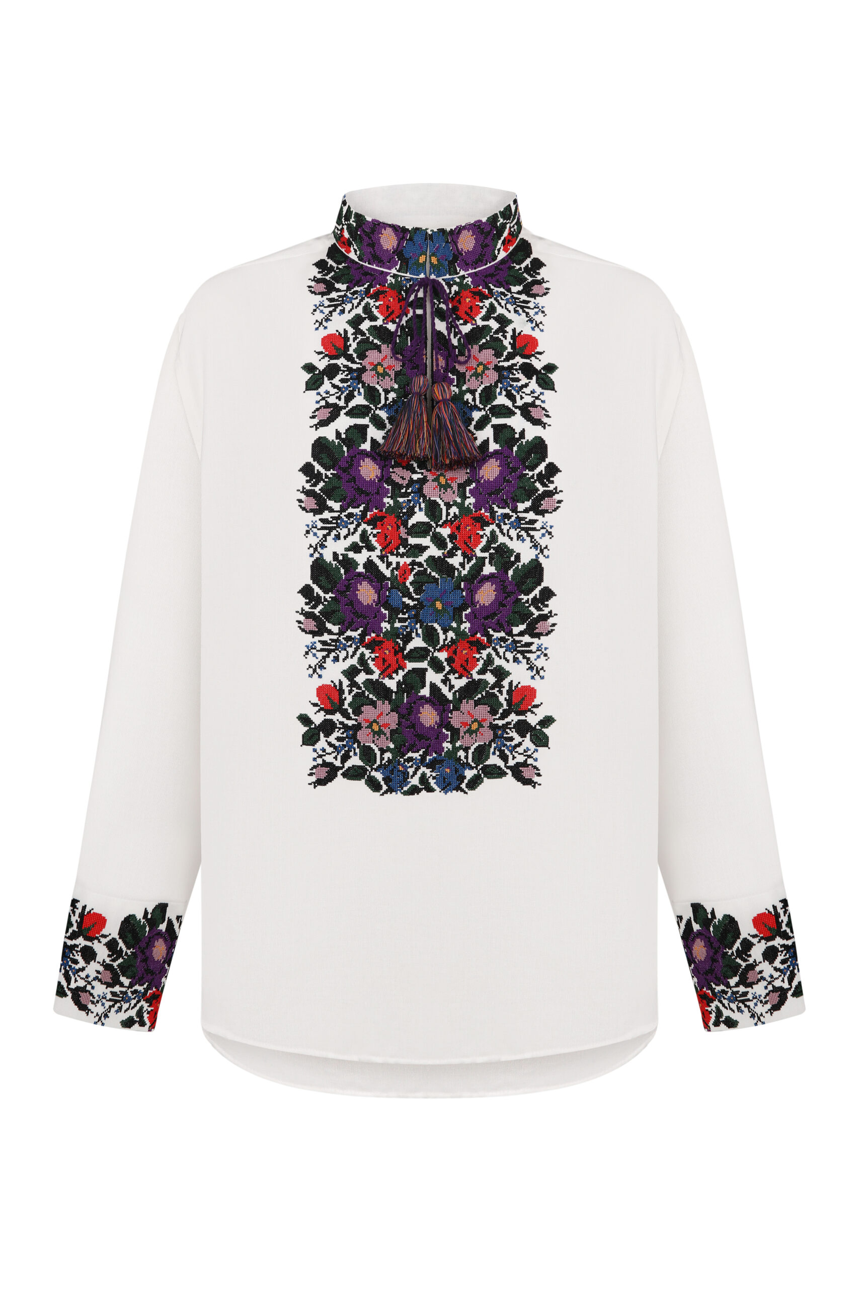 Сорочка з вишивкою в техніці хрестик. Тканина льон білий. Сорочка на проріз з комірцем вишитою стійкою. Вільний силует, прямий крій. Китиці ручної роботи. Манжети на кнопки.