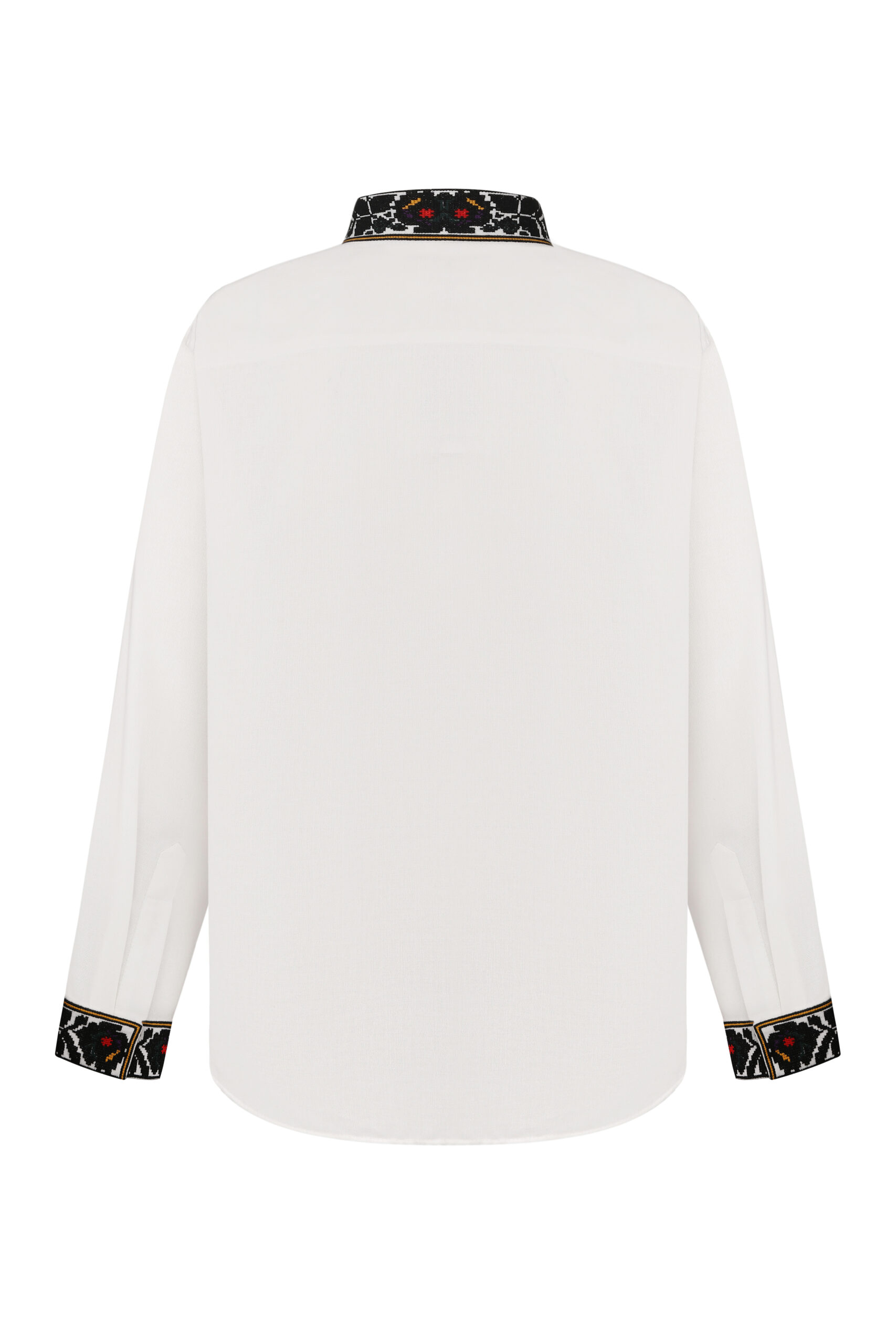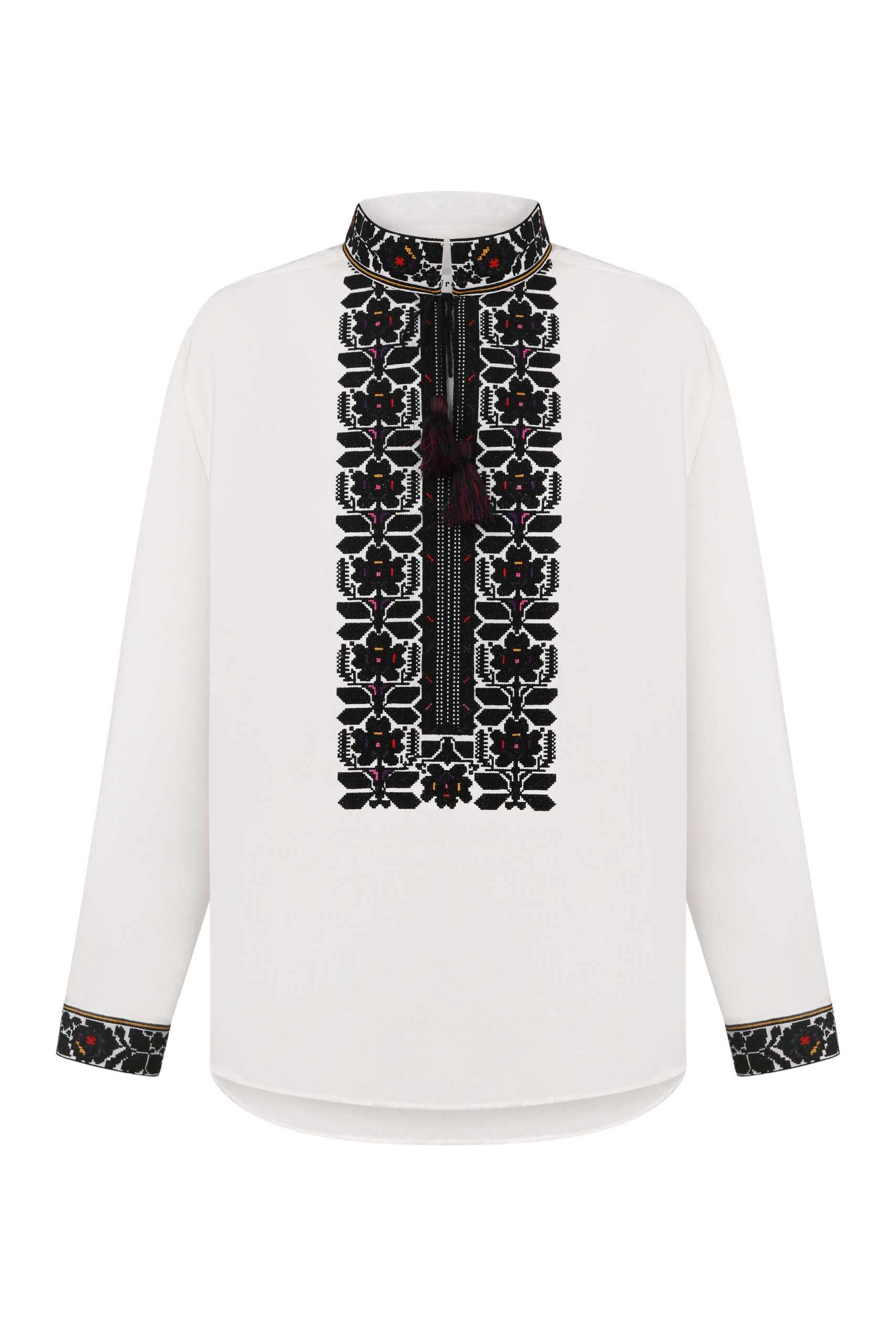 Сорочка з вишивкою в техніці хрестик. Тканина льон білий. Сорочка на проріз з комірцем вишитою стійкою. Вільний силует, прямий крій. Китиці ручної роботи. Манжети на кнопки.