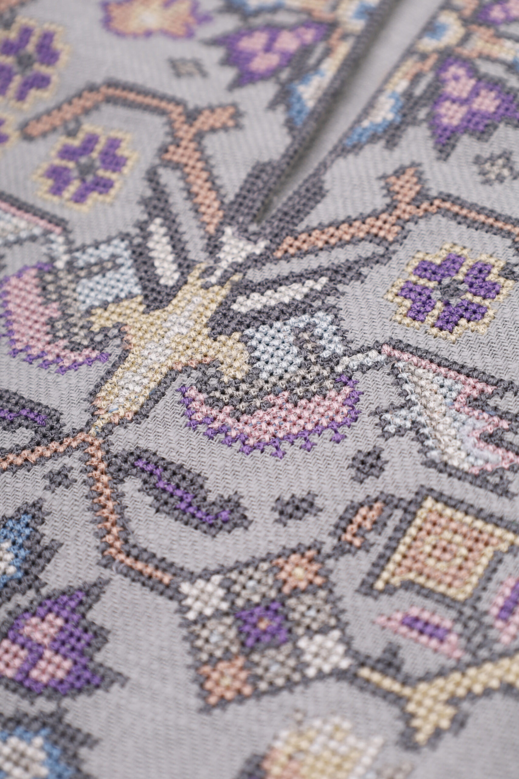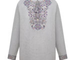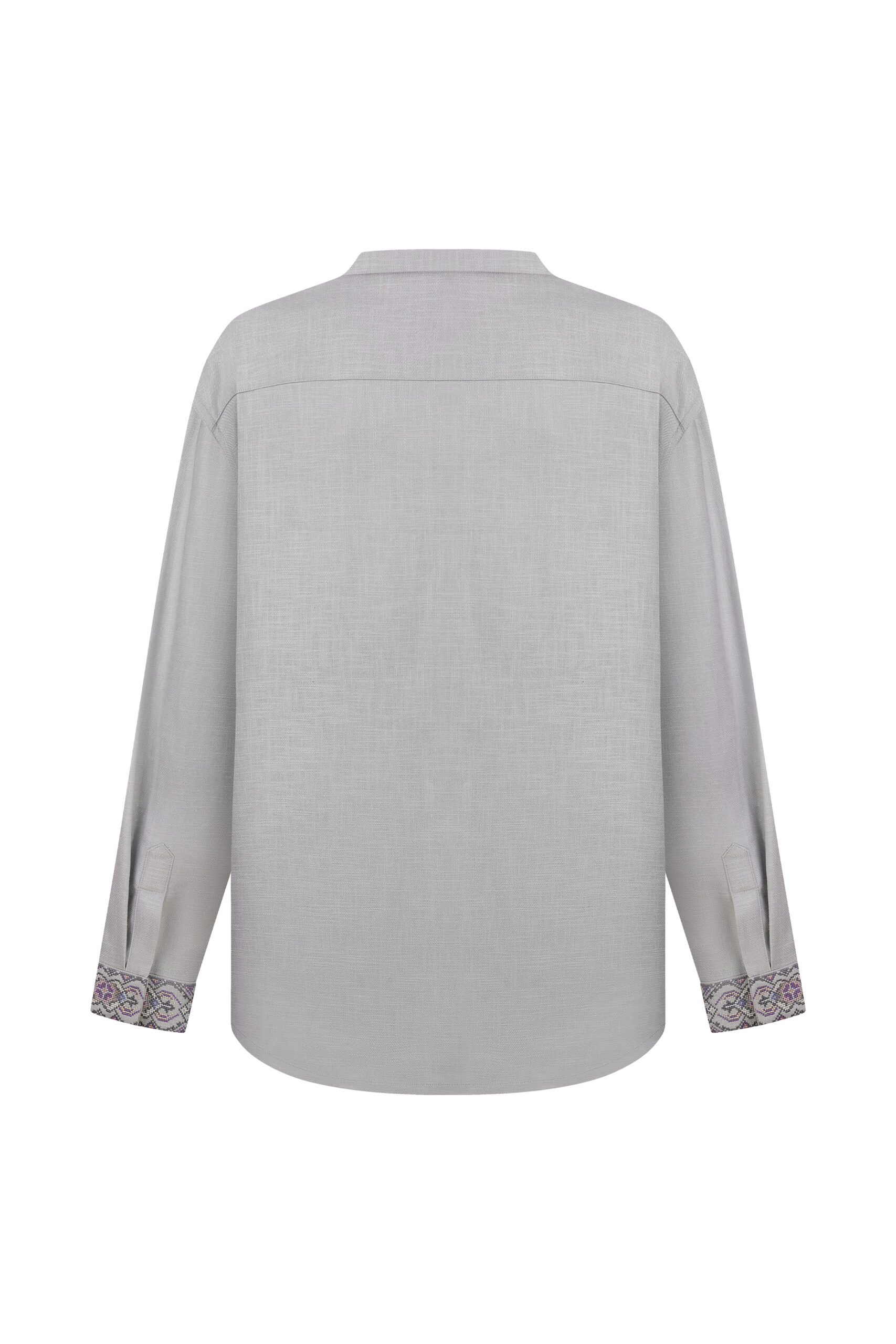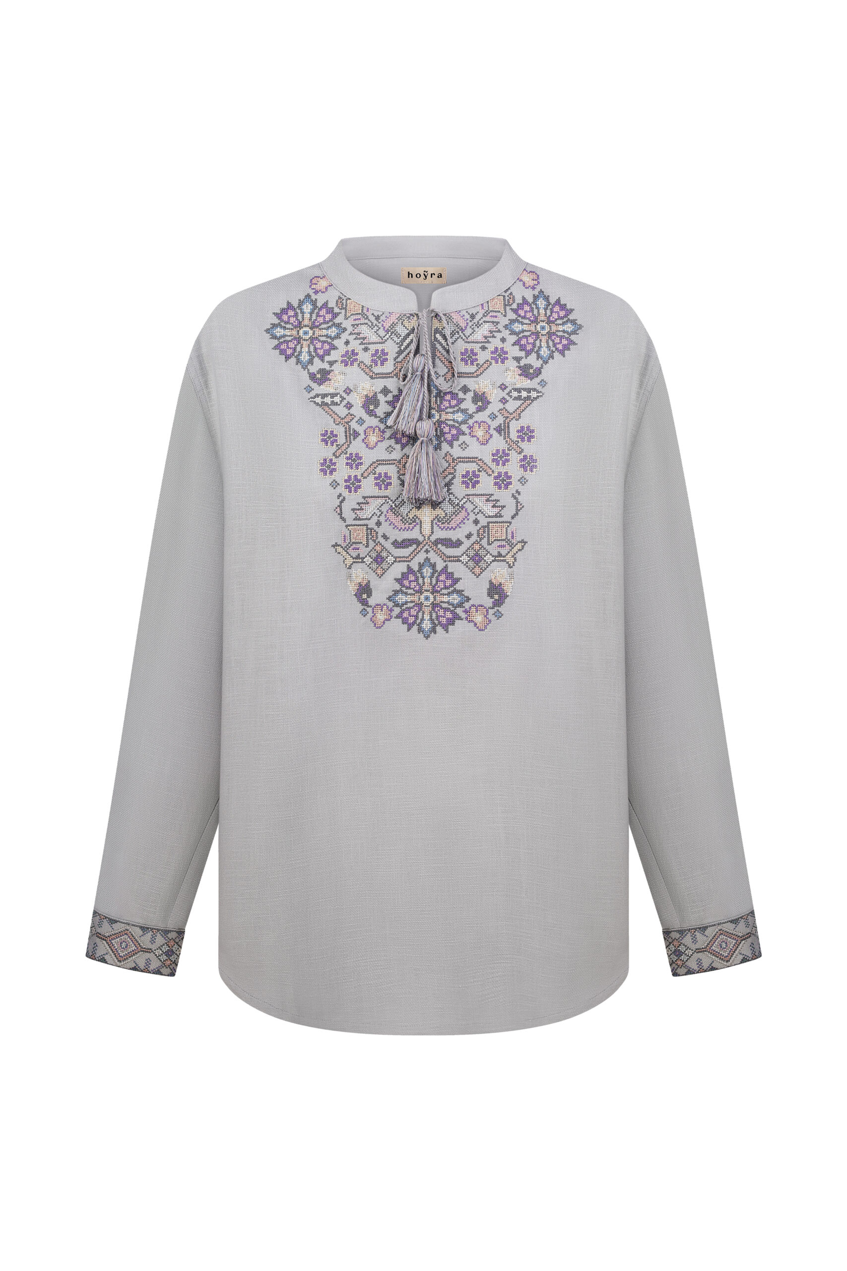 Сорочка з вишивкою в техніці хрестик. Тканина льон сірий. Сорочка на проріз з комірцем пологою стійкою. Вільний силует, прямий крій. Китиці ручної роботи. Манжети на кнопки.