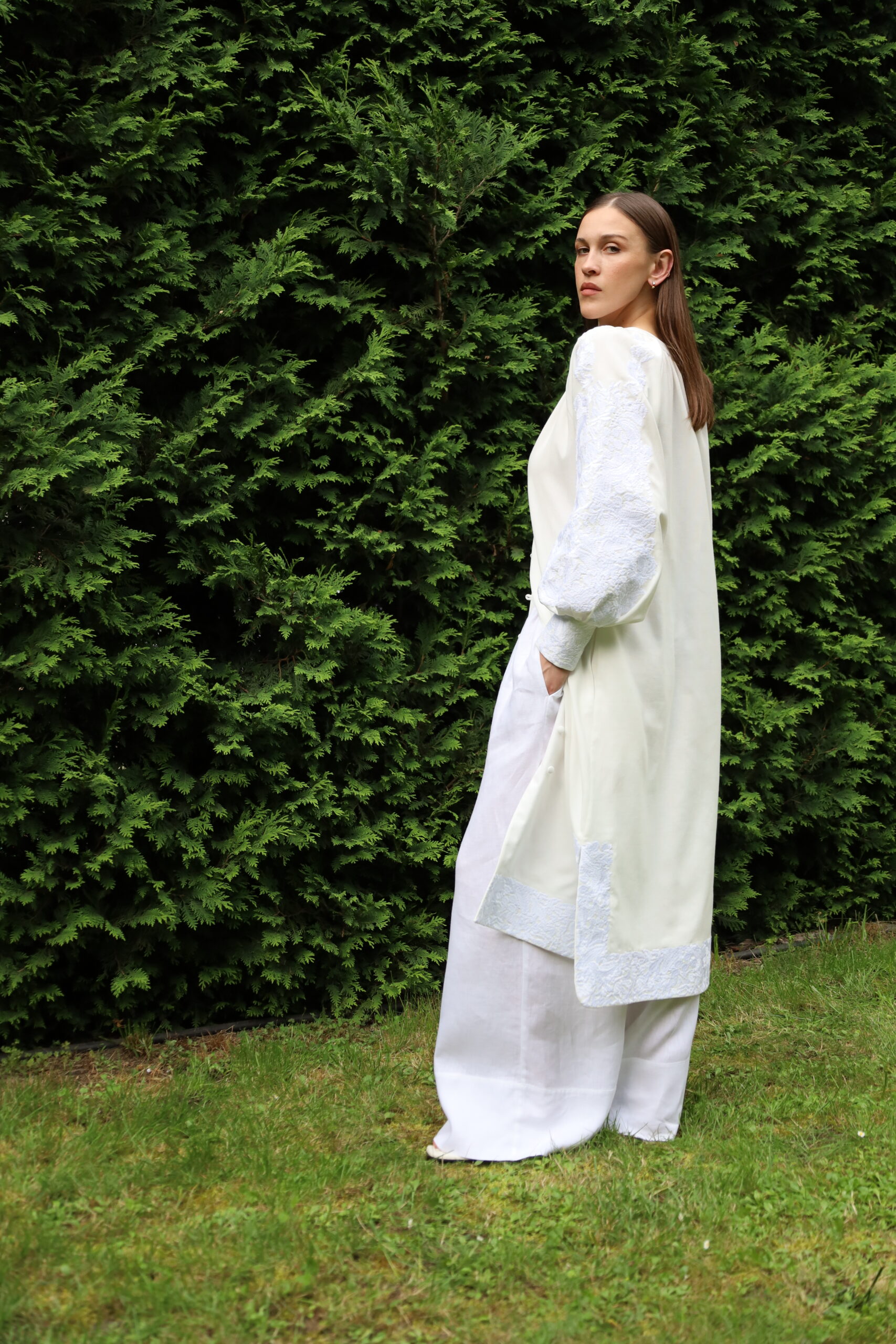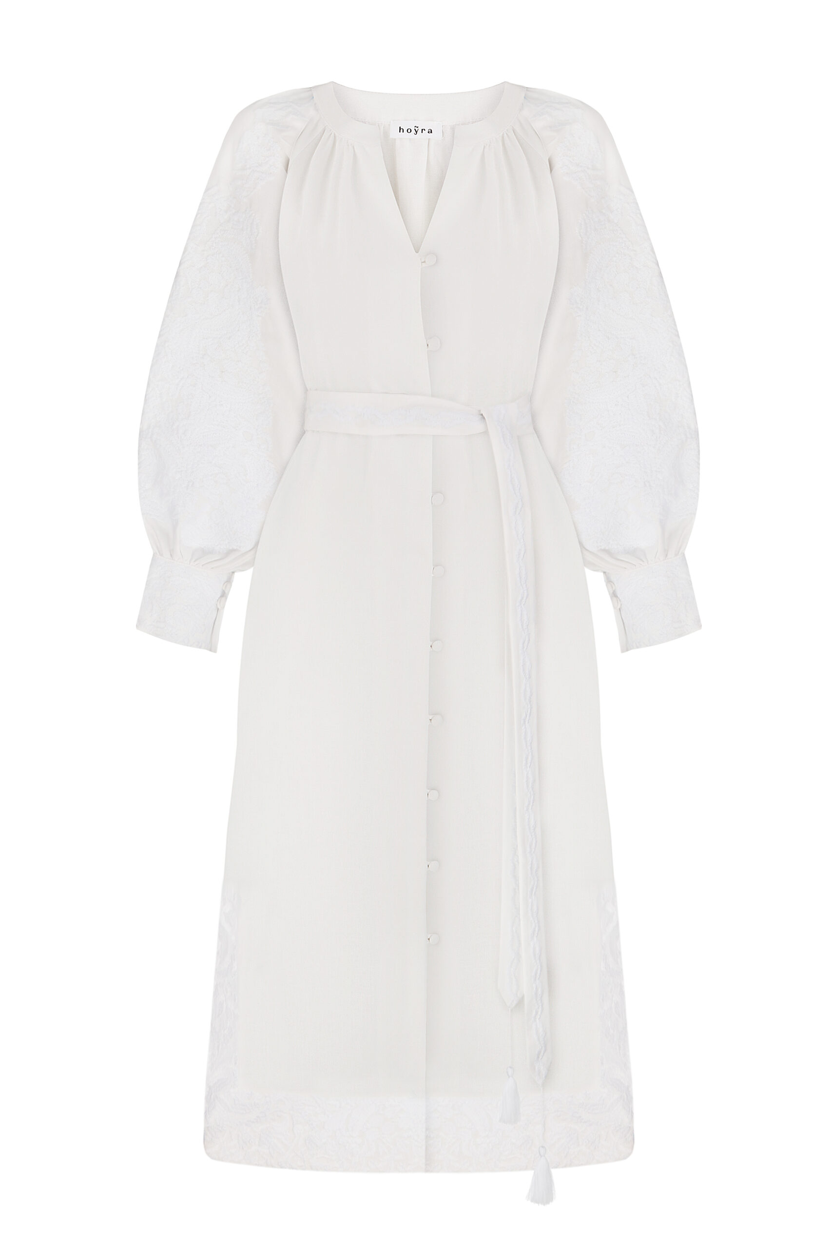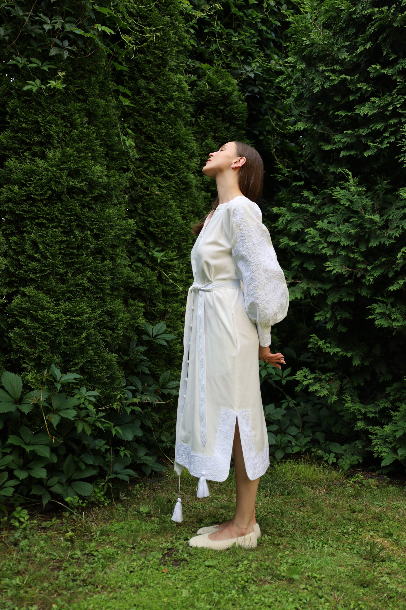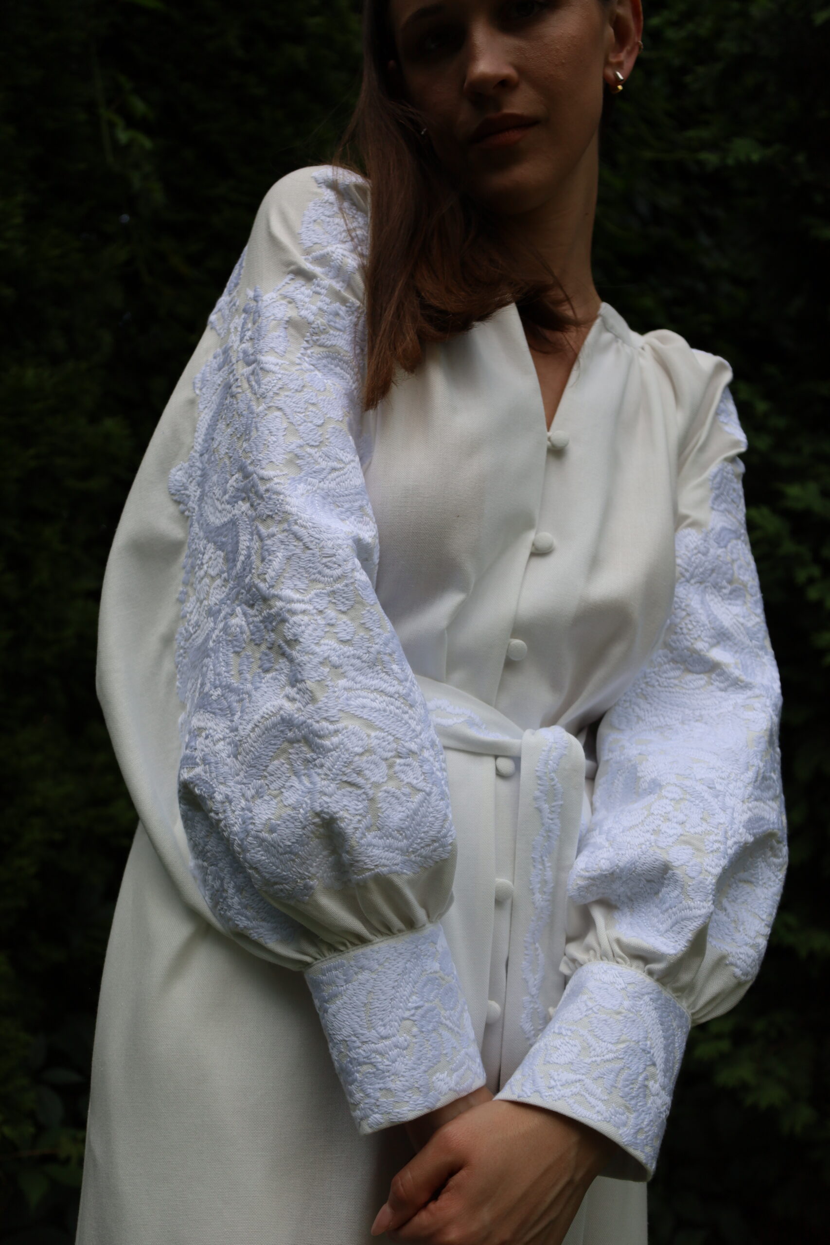 Сукня Перо з ніжною білою вишивкою гладдю. Виконана на білому льоні бавовні. Фурнітура – ґудзики.