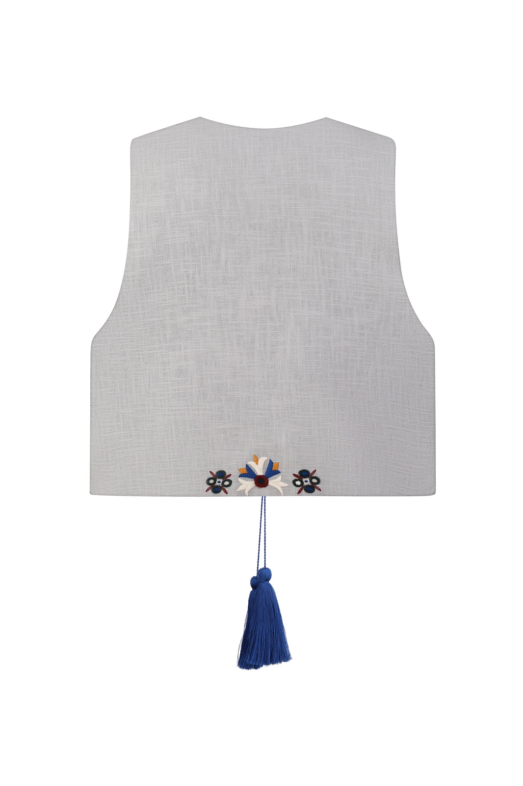 Жилет з вишивкою в техніці гладь. Тканина 100% льон. Прямий крій, вільний силует, вкорочений. На підкладці: льон 100%. Китиці ручної роботи. Довжина виробу по спинці 46 см.