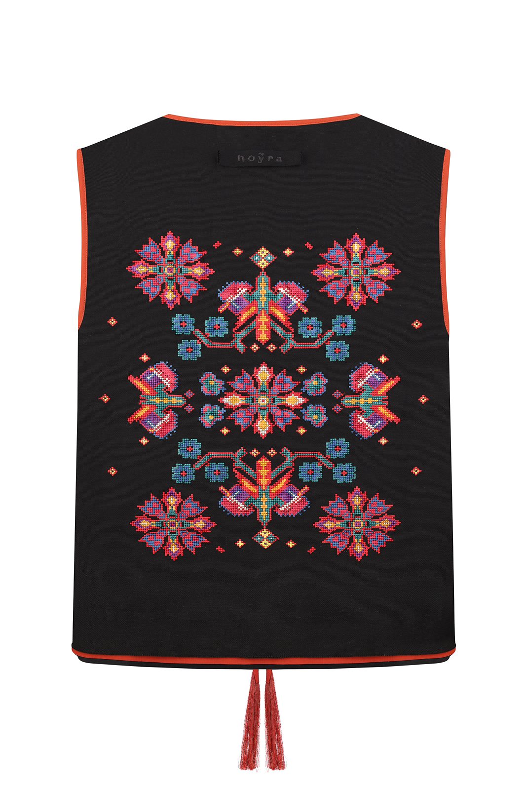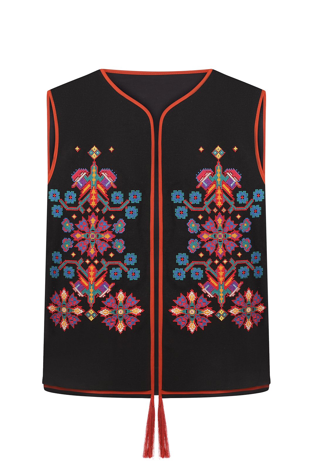 Жилет з вишивкою в техніці хрестик (машинна вишивка). Тканина канвас: бавовна 95% полістер 5%, підклада: бавовна 50% полістер 50%. Прямий крій, вільний силует, виступаюче плече. На підкладці, китиці ручної роботи. Довжина виробу по спинці ~75 см.
