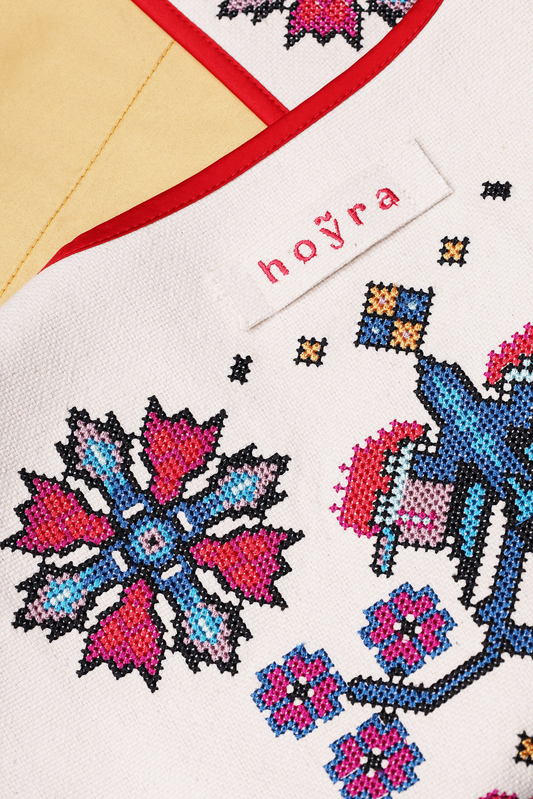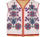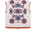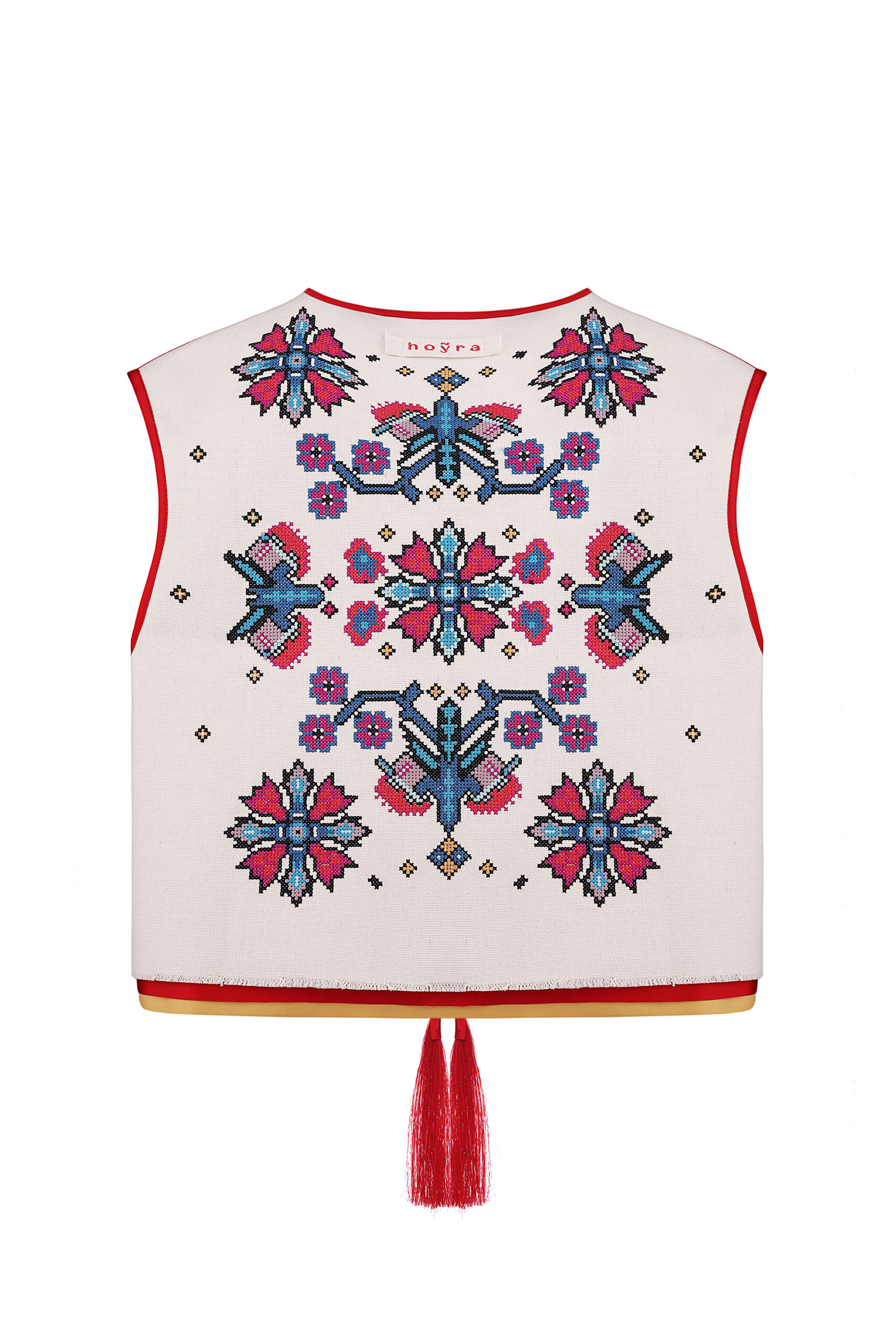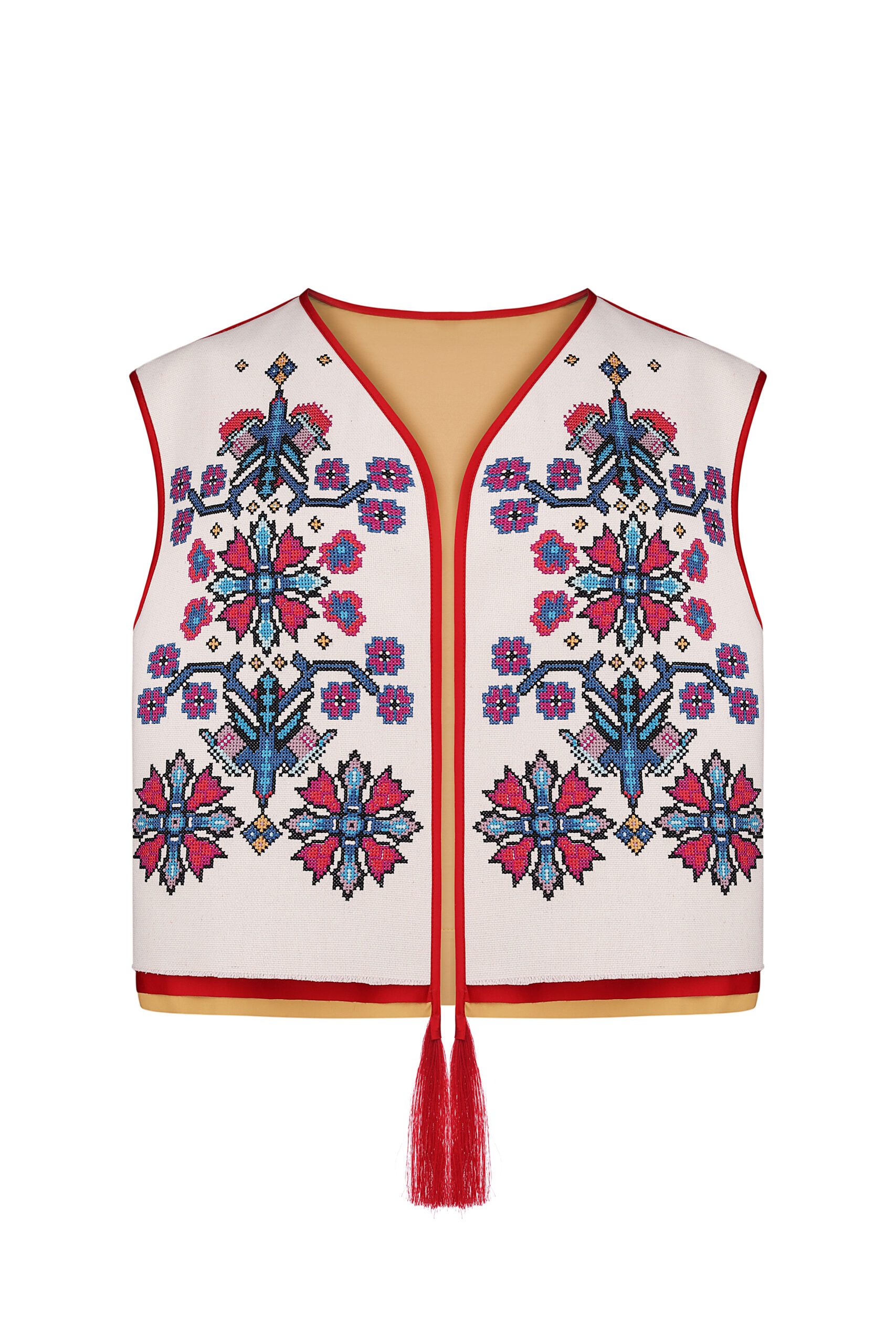 Жилет з вишивкою в техніці хрестик (машинна вишивка). Тканина канвас: бавовна 50% полістер 50%, підклада: бавовна 50% полістер 50%. Прямий крій, вільний силует, виступаюче плече. На підкладці, китиці ручної роботи. Довжина виробу по спинці 56 см.